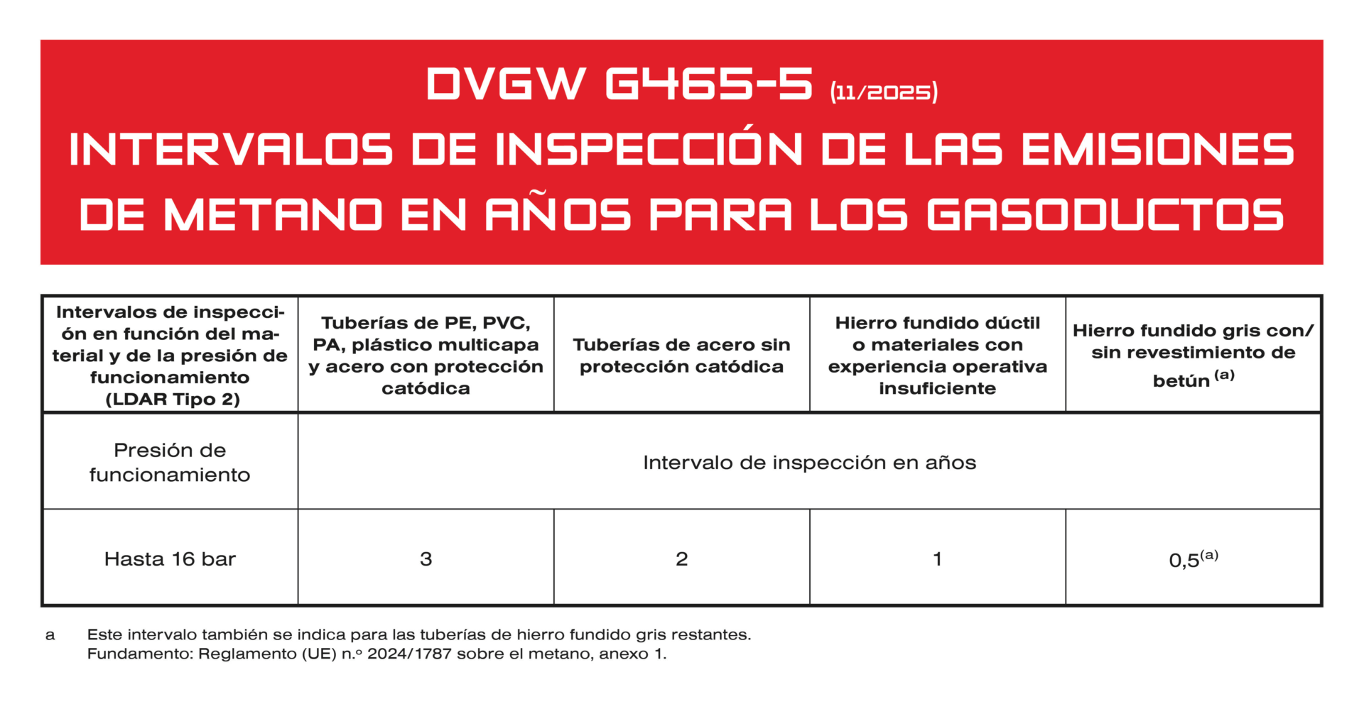 La versión revisada de la G465-1 (borrador 11/2025) se está adaptando, entre otras cosas, para garantizar la compatibilidad con el Reglamento de la UE sobre el metano 2024/1787 en lo que respecta a los intervalos de inspección. Tiene en cuenta que la frecuencia de las fugas de gas depende del material. Esta relación y la necesaria estandarización constituyen la base de los nuevos intervalos de inspección orientados al material en el borrador de la norma G465-1; véase la Tabla 1.